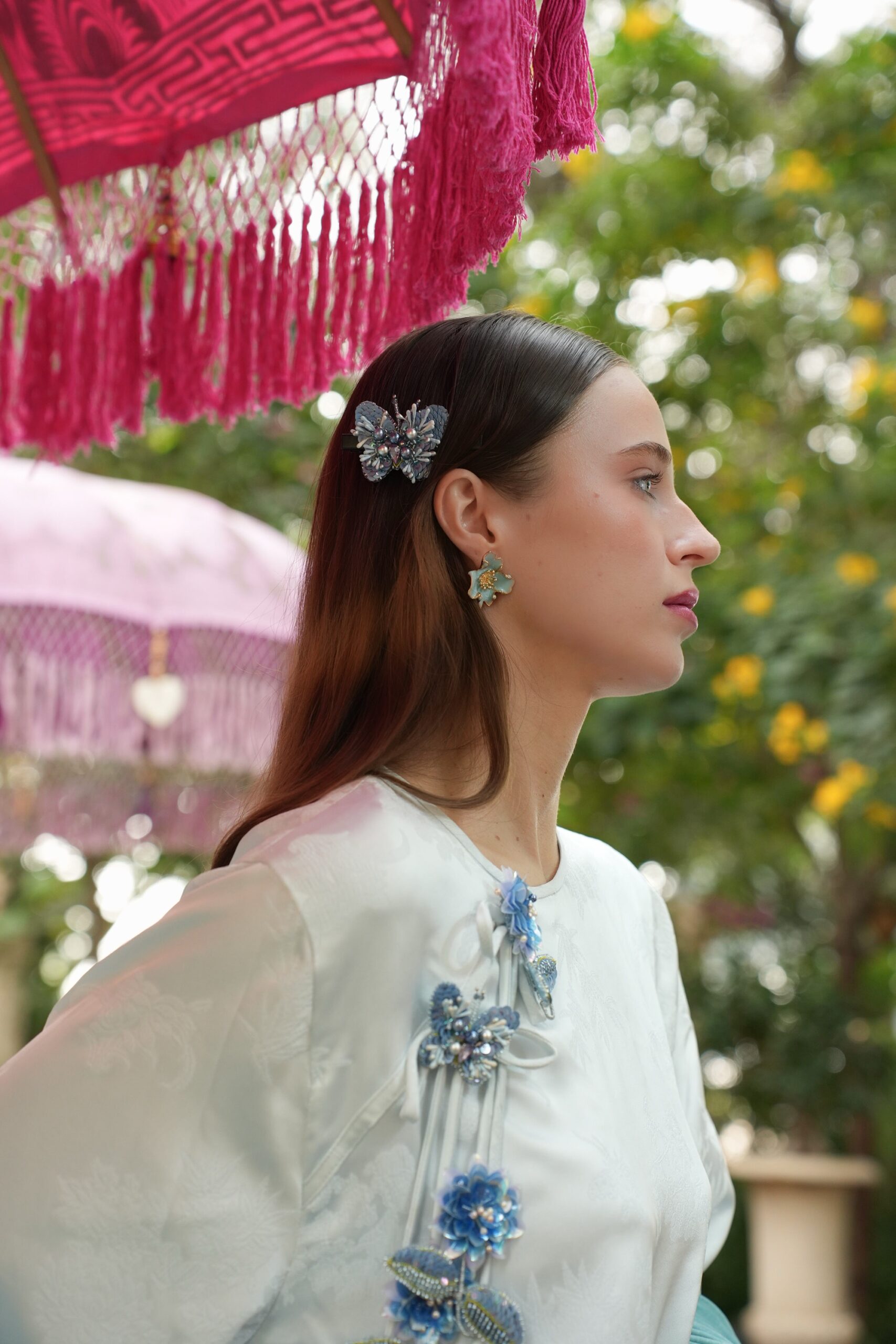 A hand embellished butterfly hair clip designed to complement the Moonlit Butterflies kaftans and velvet scarves.